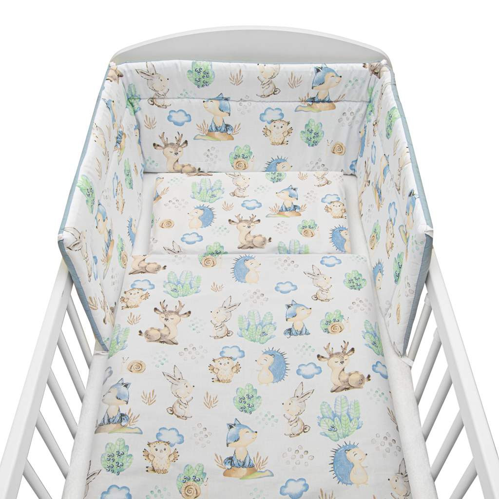3-részes ágyneműgarnitúra New Baby. Párnahuzatot 40x60 cm, takaró huzatot 100x135 cm és rácsvédőt 31x175 cm tartalmaz. Puha minőségi anyagból készült. Összetétel: 100% pamut. Ezek a termékek biztonságosak, mivel: a természetes pamut nem okoz bőrirritációt, mivel nem tartalmaz formaldehidet és egyéb, csecsemőkre káros anyagokat. Nem veszítenek színeik élénkségéből és nem színezi el a többi ruhát. Kellemes mintázatúak és színei nyugtató hatásúak. Nem tartalmaznak gombokat, sem műanyag illetve acél darabkákat, melyek veszélyesek lennének gyermeke számára. A párna és a paplan töltete antialergén anyagból készült ami azt jelenti, hogy nem terjeszt mikroorganizmusokat és penészt. Az termékek gépi gyártmányúak. Emiatt a minta eltérő lehet a fotótól.