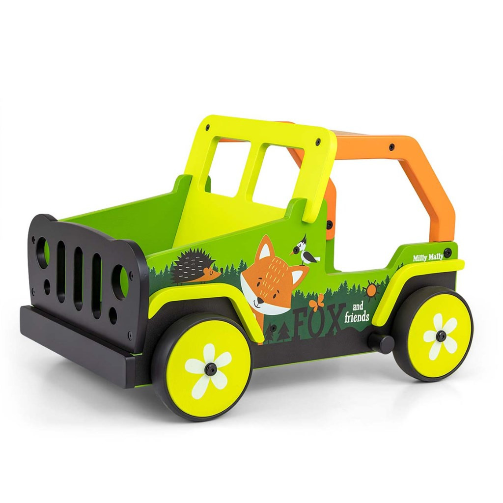 Ez a legendás terepjárók ihlette járássegítő kiváló minőségű fából és környezetbarát anyagokból készült. A kerékborítások puha TPR műanyagból készültek, amely rugalmas és tartós, és lehetővé teszi a használatát minden felületen sérülés és karcolás nélkül. Nem tartalmaznak lágyítószereket és környezetbarátak.