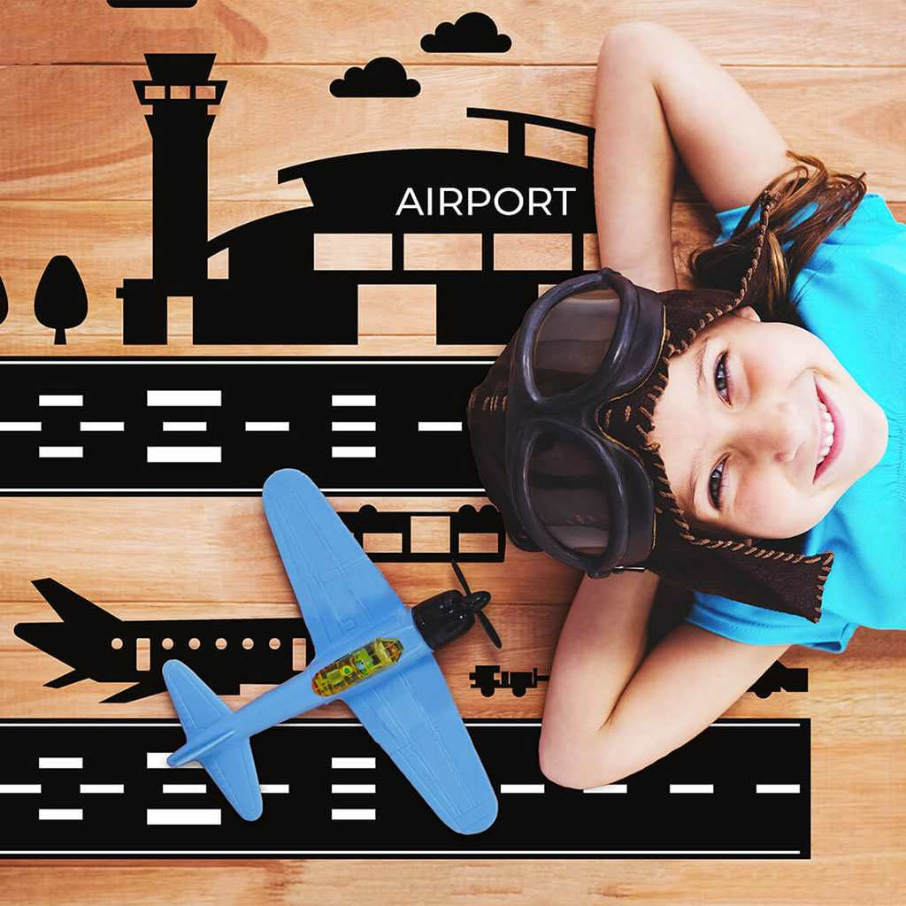 Gyönyörű Repülőtér padlómatrica. A repülőtér padlómatrica az égi kalandok szerelmesei számára készült. Hiszen ki nem akart gyerekkorában pilóta lenni :). Segítünk megvalósítani az álmokat, és mennyei szórakozást garantálunk anélkül, hogy felesleges helyet foglalnánk a gyerekszobában.Termékünk egyedi és a maga nemében páratlan. Különleges fóliából és matt laminátumból készült, amely garantálja a felület tartósságát és letörölhetetlenségét. A padlómatrica bármilyen más sima felületre, például falra vagy bútorra is felragasztható. Ne várjon tovább. Lepje meg gyermekét rendkívüli szórakozással, és csökkentse a takarítási időt. A készlet tartalma: repülőtér (90 x 77 cm), kiegészítő elemek. A pontos méretek az utolsó képen láthatóak.